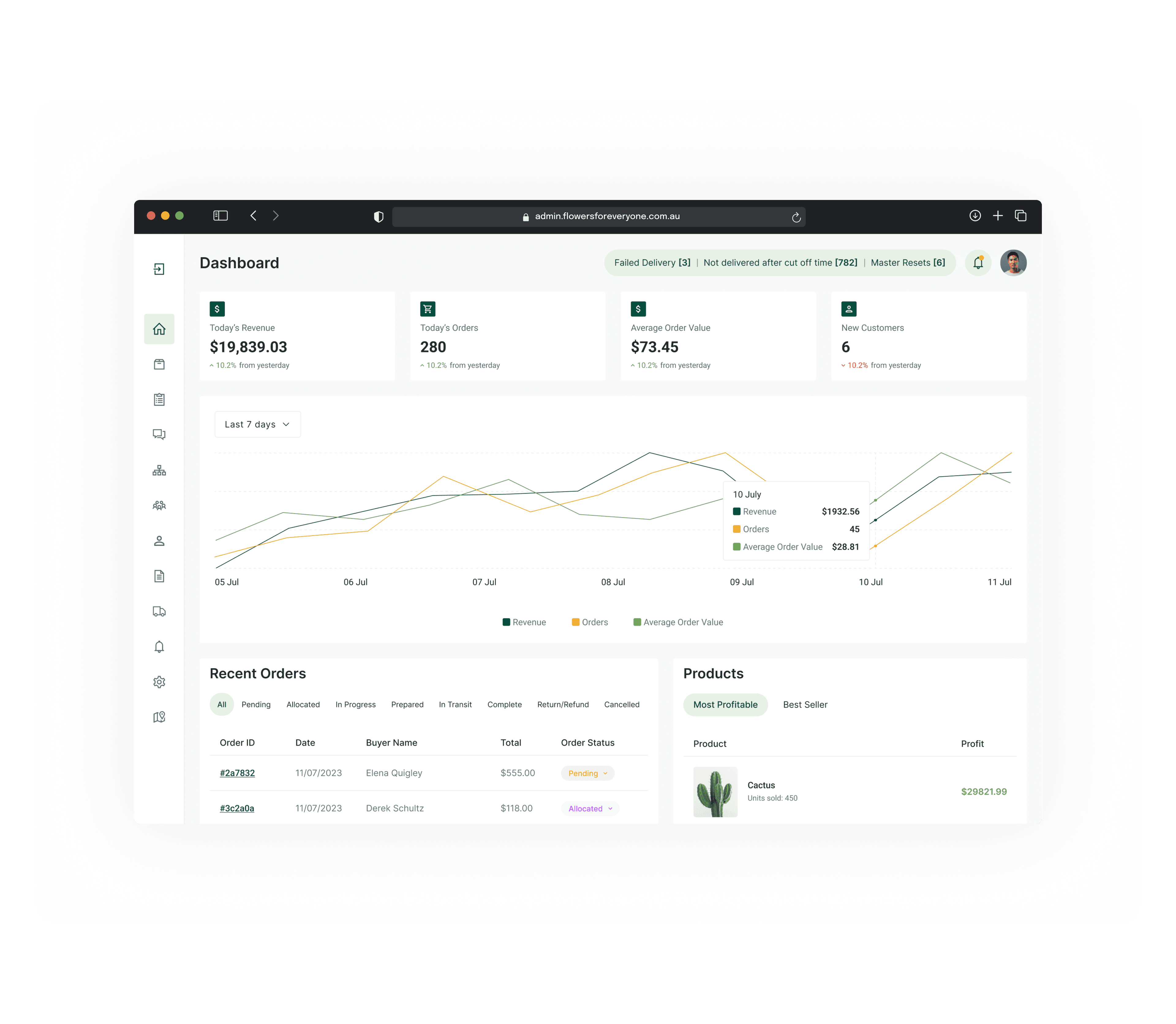 Online flower marketplace dashboard