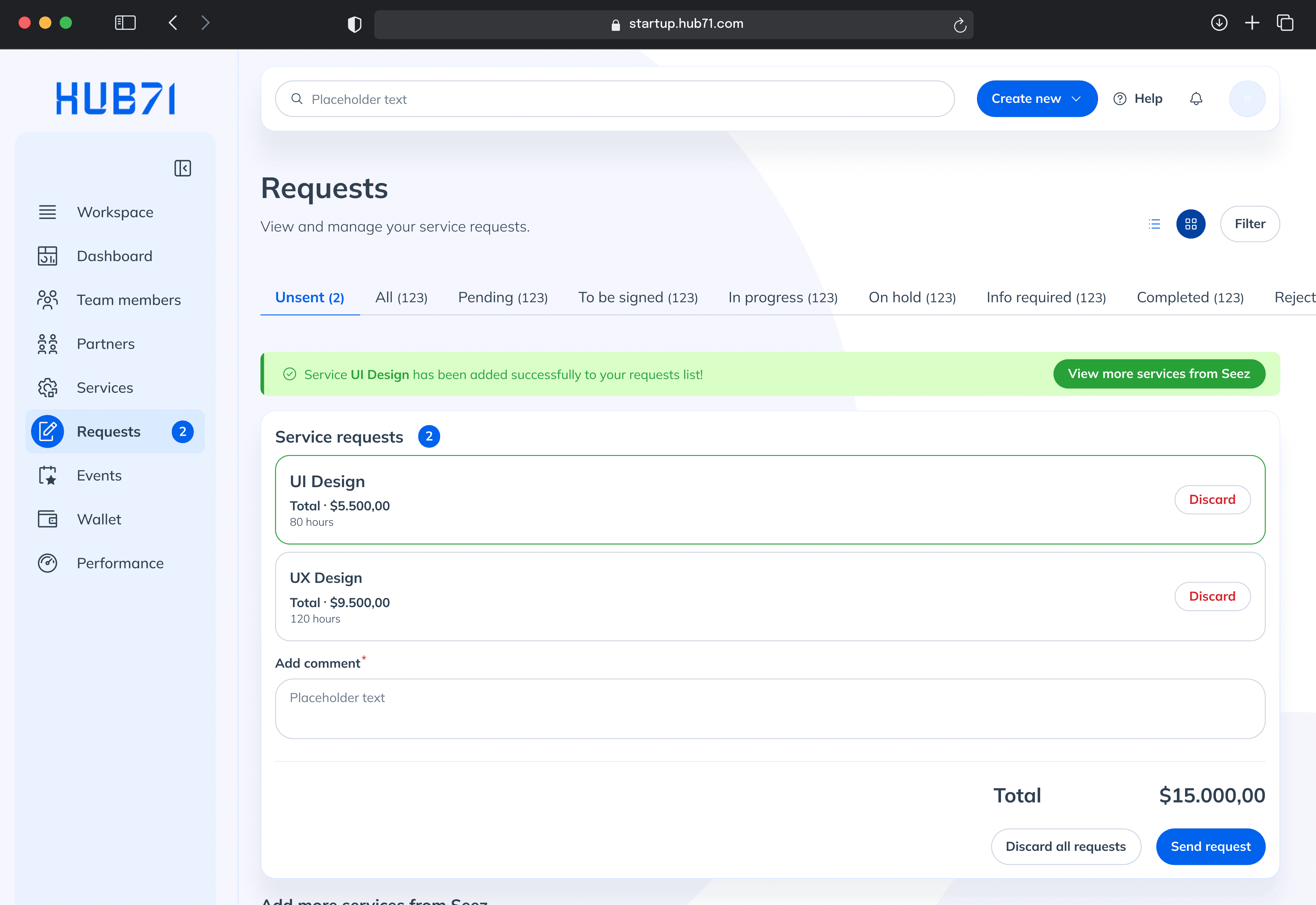 HUB71 is one of the world’s leading tech startup ecosystems, based in Abu Dhabi. Its value lies in the network — a curated set of service providers that startups can access as they grow. The challenge was building a platform that could handle the full lifecycle of service procurement, from discovering a provider through to contracting, status tracking, and ongoing communication, without the friction that early-stage companies typically face when engaging large corporate partners.