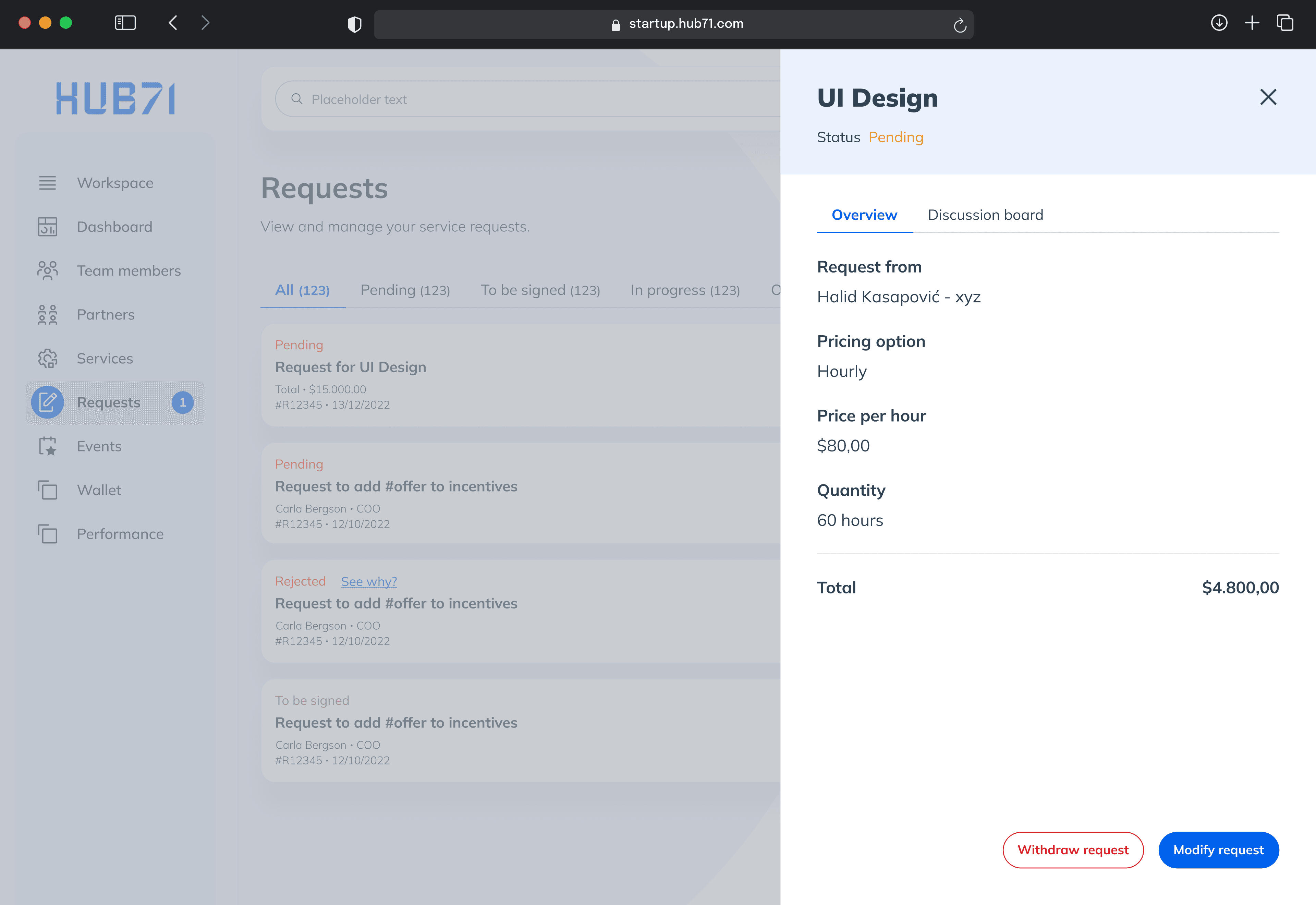 Startup needs change quickly. A service that made sense at the time of request might need to be paused, modified, or withdrawn as priorities shift. We designed the request detail to give startups visibility into what they’ve committed to — pricing structure, hours, total — and the ability to act on it before it progresses. This was particularly important for hourly engagements where scope can drift.