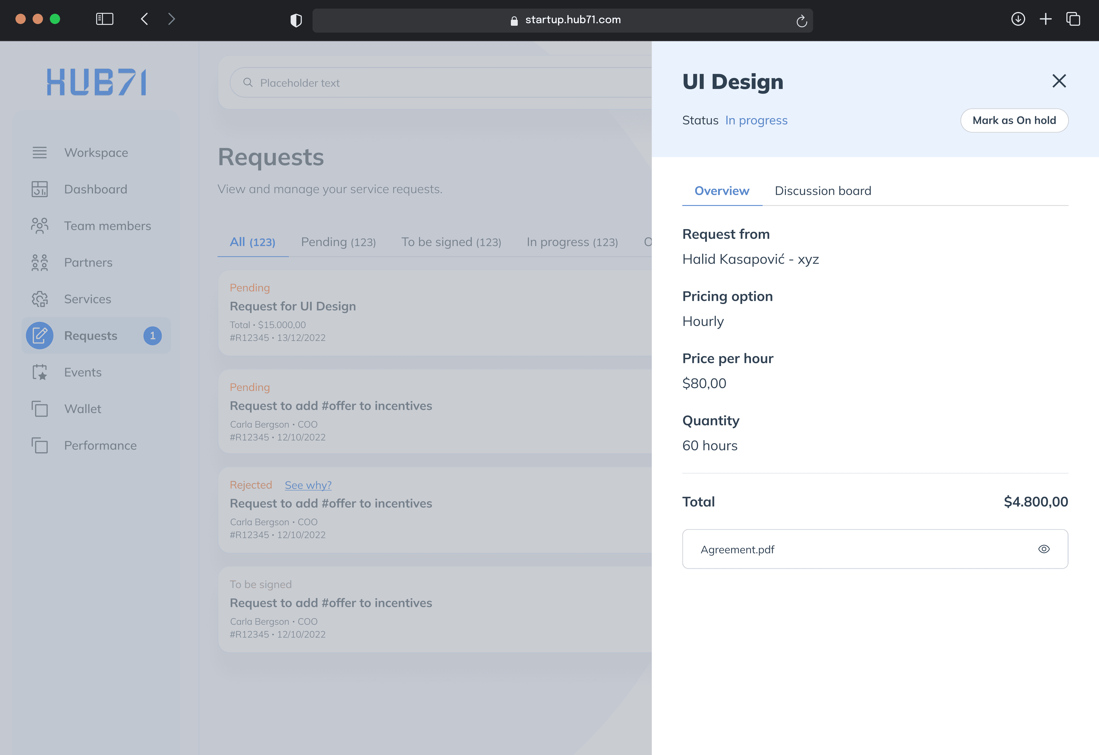 Without a dedicated system, the records of a service engagement scatter across emails, messages, and file attachments. When something goes wrong — or when context needs to be established months later — piecing that together is painful. We built the request detail to hold everything in one place: the agreed terms, signed documents, and current status. Both the startup and the provider always have the same picture.