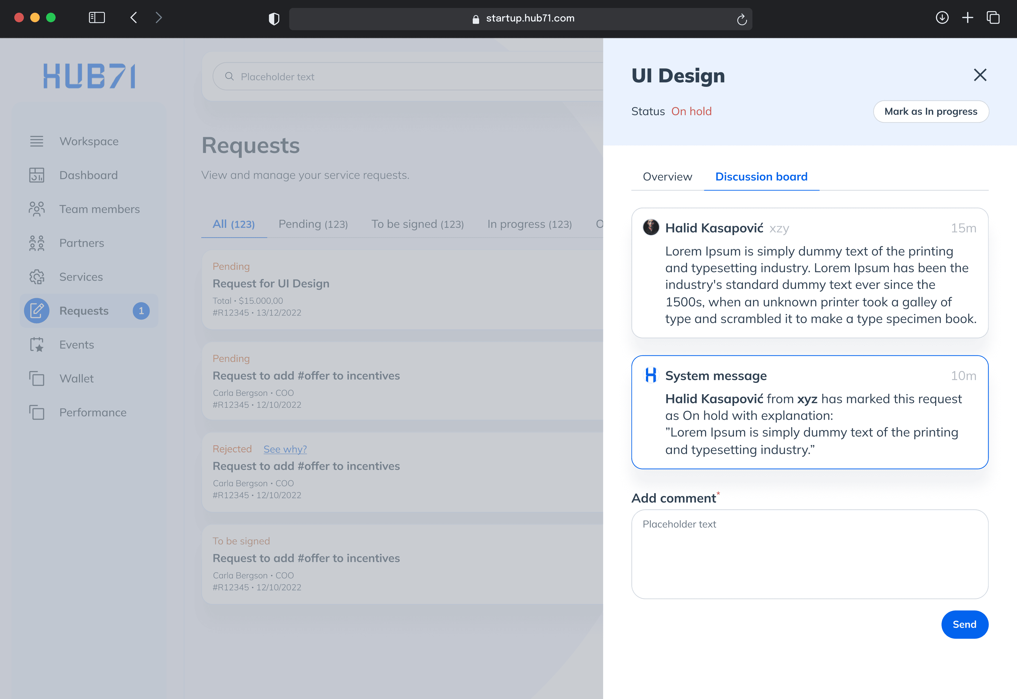 Service relationships involve negotiation, clarification, and status updates — and when that communication lives in email or chat, it disconnects from the actual request. We introduced a discussion thread tied directly to each service request, with automatic system messages logging every status change. This gives startups and providers a shared record of how the engagement evolved, and removes the need to reconstruct history from scattered messages.