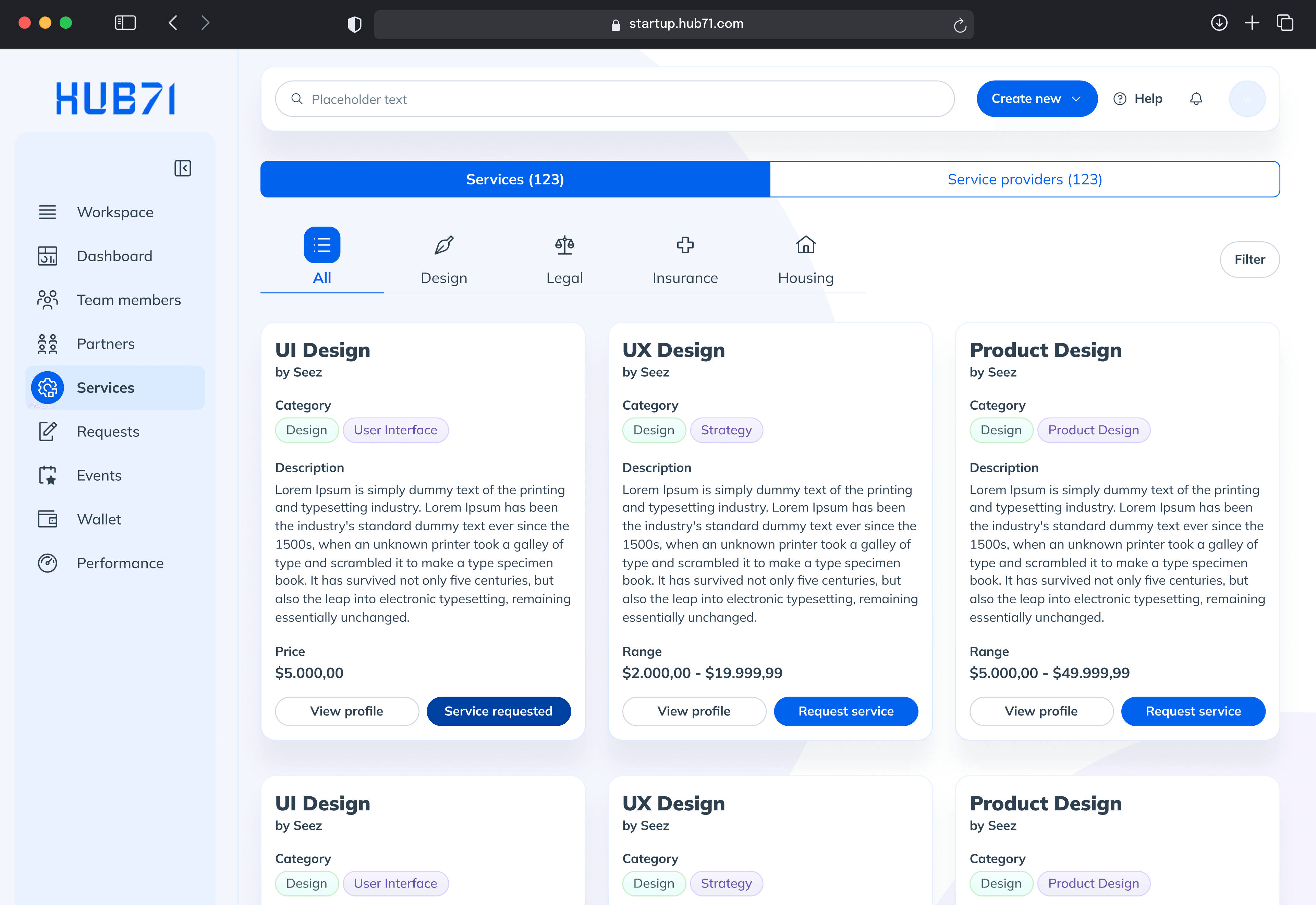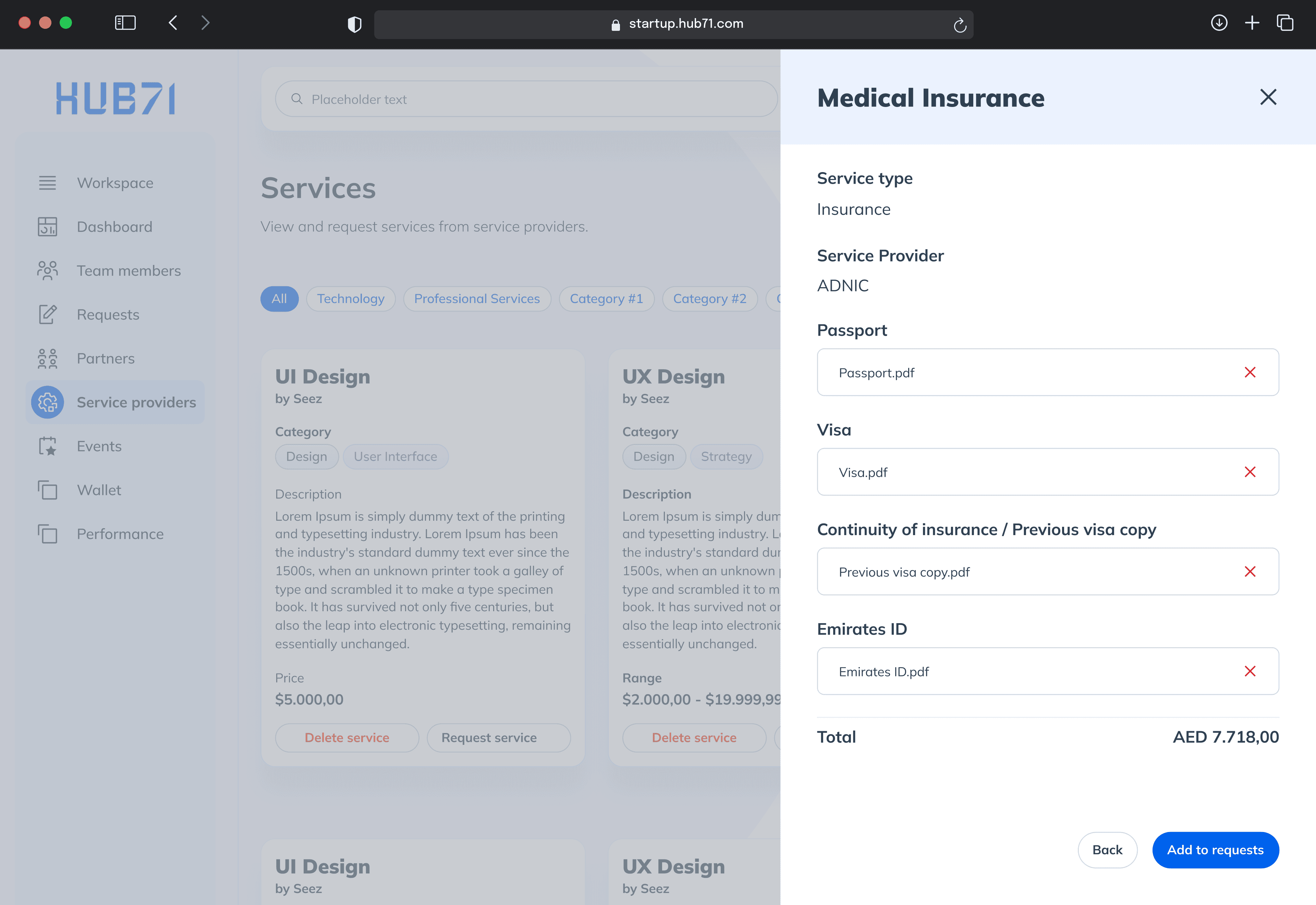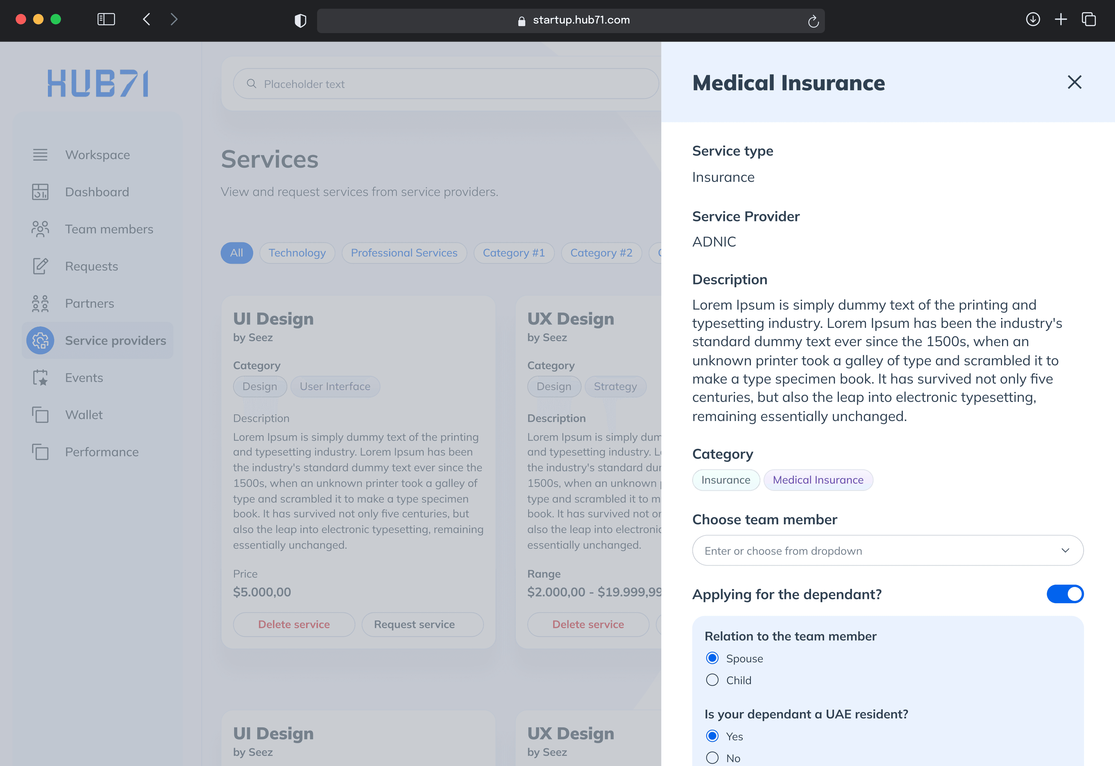 - Built a unified service marketplace giving startups direct access to HUB71’s full network of providers — legal, tech, insurance, design — from a single platform - Designed a full request lifecycle with status tracking across seven stages, giving startups and providers a shared view of where every engagement stands - Structured complex service forms — including insurance with dependant configuration and document uploads — so startups can navigate high-stakes procurement without specialist knowledge