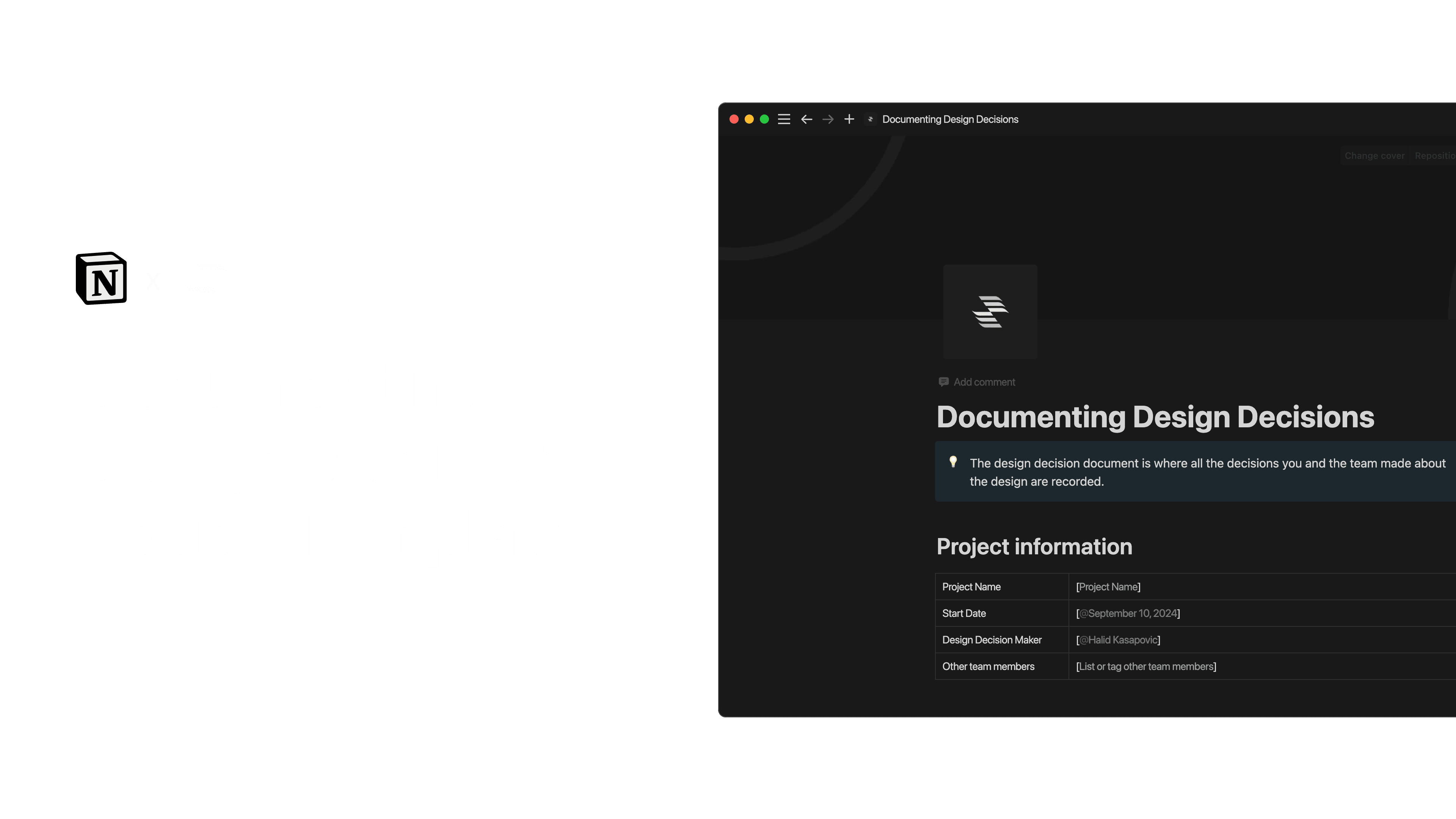 A Notion template for documenting design decisions with your team and keep transparency on high level. Includes database and sample of a single design decision.